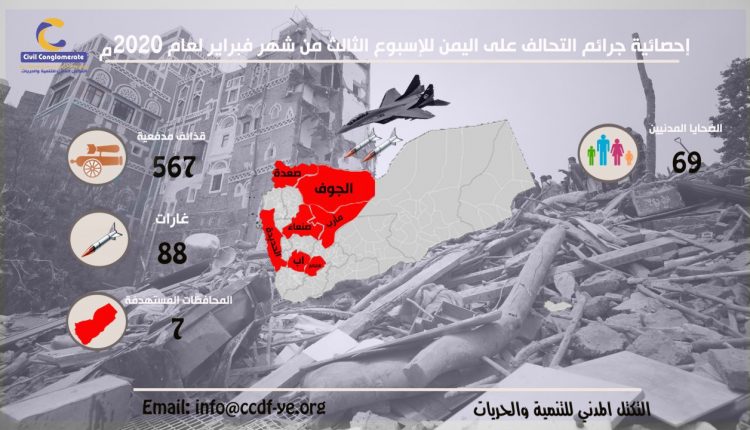 التوثيق المرئيمعرض الصور إحصائية جرائم التحالف خلال الاسبوع الثالث من شهر فبرير 2020 Last updated فبراير 22, 2020 Share Share FacebookTwitterGoogle+WhatsAppPinterestالبريد الإلكترونيLinkedinTelegramPrint