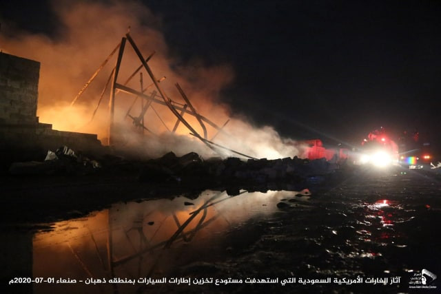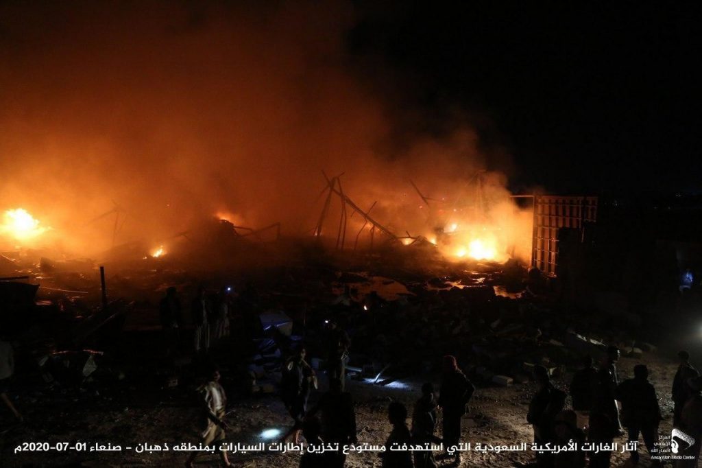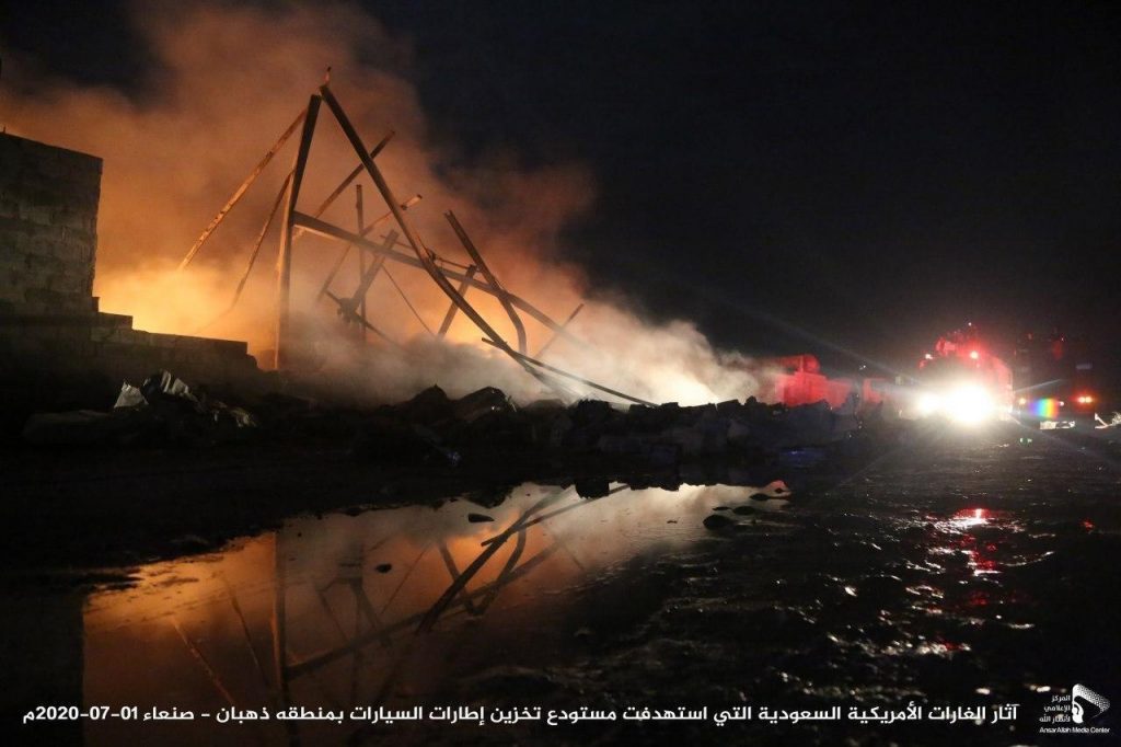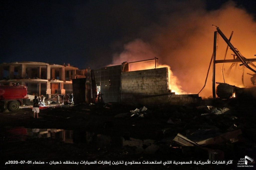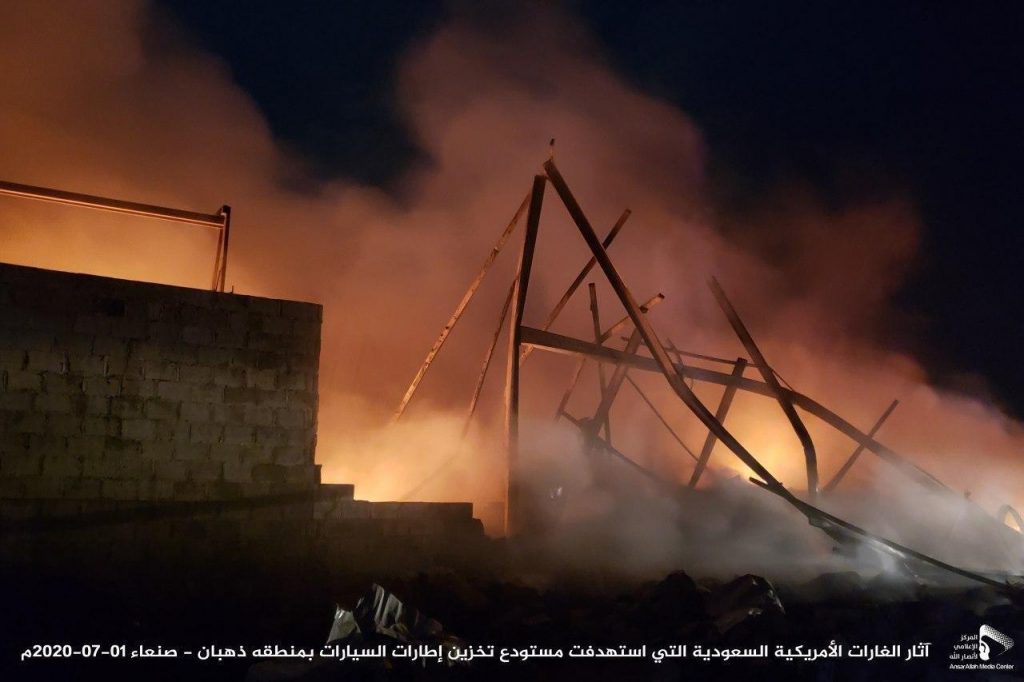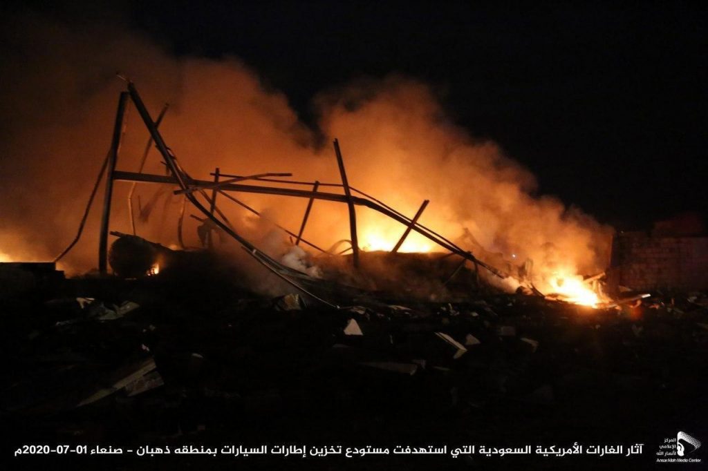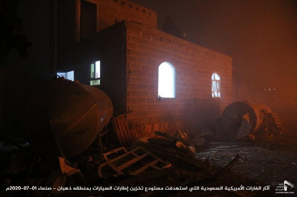 وقال المصدر: إن “طيران التحالف دمر أيضا بغارتين مستودعا لتخزين إطارات السيارات في منطقة ذهبان بمديرية بني الحارث، وتسبب في نشوب حريق هائل في المكان، اتلف محتويات المستودع بالكامل”.