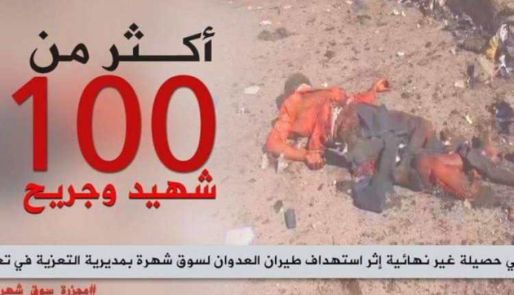وما إن وصلت الى سماء مديرية التعزية حتى افرغت ما بجوفها من وحشية واجرام على المتسوقين لتحصد غالبيتهم بين شهيد وجري