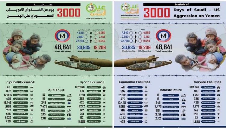 The Eye of Humanity Center for Rights and Development issued, Sunday some statistics on US-Saudi aggression crimes after 3,000 days.