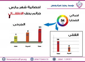 التوثيق المرئي تنشر مؤسسة يمانيات صور احصائيات لشهر مارس جرائم بحق النساء و الاطفال اليمنين Last updated أبريل 1, 2018 Share Share FacebookTwitterGoogle+WhatsAppPinterestالبريد الإلكترونيLinkedinTelegramPrint