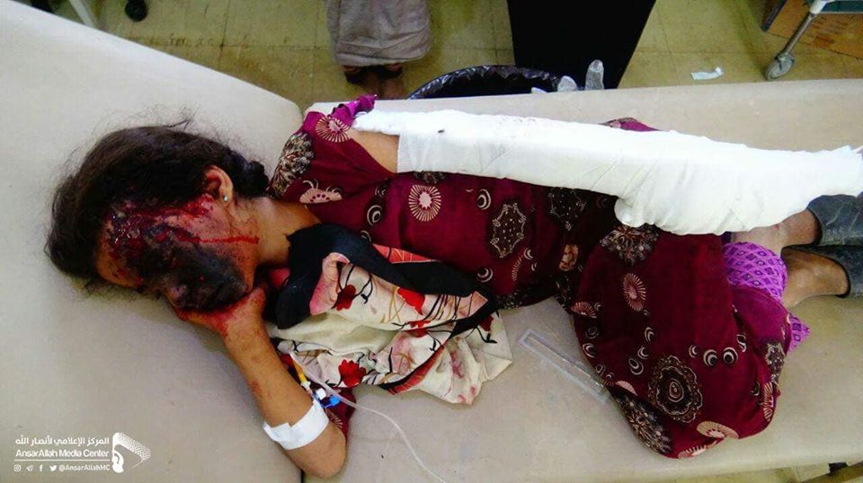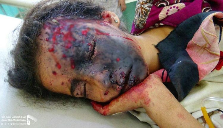 اصيبت الطفلة (هنوف خالد) أمس الأحد ، 30 أيلول/سبتمبر 2018 ، أثرانفجار قنبلة عنقودية لتحالف العدوان الذي تقوده المملكة العربية السعودية في مديرية سحار بمحافظه صعده.
