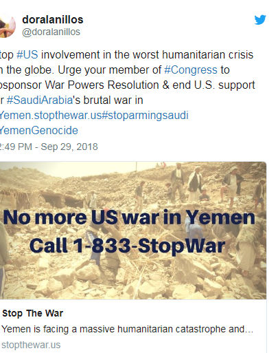 “أوقفوا تدخل أميركا في أسوأ كارثة إنسانية على الأرض. اضغطوا على أعضاء الكونغرس والجهات المشاركة في رعاية الحرب وفي القرارات الحربية، أن توقف دعم أميركا للسعودية التي تشن الحرب الوحشية على اليمن”.