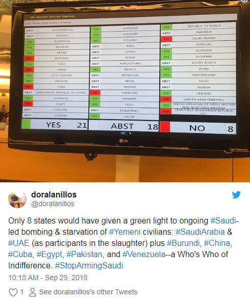 وأضاف “doralanillos” أن الدول التي صوتت ضد وقف الحرب، وانتهاك حقوق الإنسان في اليمن، بمجلس الأمم المتحدة بالإضافة للسعودية والإمارات (اللتان شنتا الحرب عى اليمن)، هي: بوروندي، والصين، وكوبا، ومصر، وباكستان، وفنزويلا.