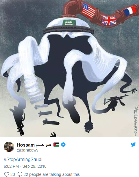 أطلق ناشطون عالميون، مؤخرًا، على مواقع التواصل الاجتماعي وسم #StopArmingSaudi والذي يعني كفى للتسليح السعودي، إذ تشتري السعودية سلاحًا من أميركا وبريطانيا وفرنسا، لاستعماله في حربها على اليمن، بالتعاون مع الإمارات.