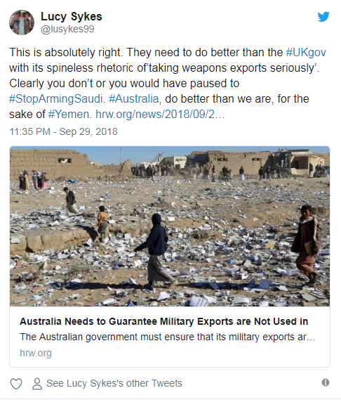 بينما طالبت المغرّدة لوسي سايكس، الحكومات الغربية، بأن تخطو خطى أستراليا التي أعلنت أنها لن تبيع السلاح الذي سيستعمل في الحرب على اليمن، وفق ما نقله موقع “هيومن رايتس ووتش”: