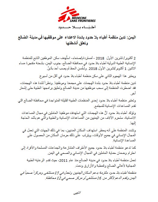 نص بيان منظمة أطباء بلا حدود للاعتداء على موظفيها بالضالع