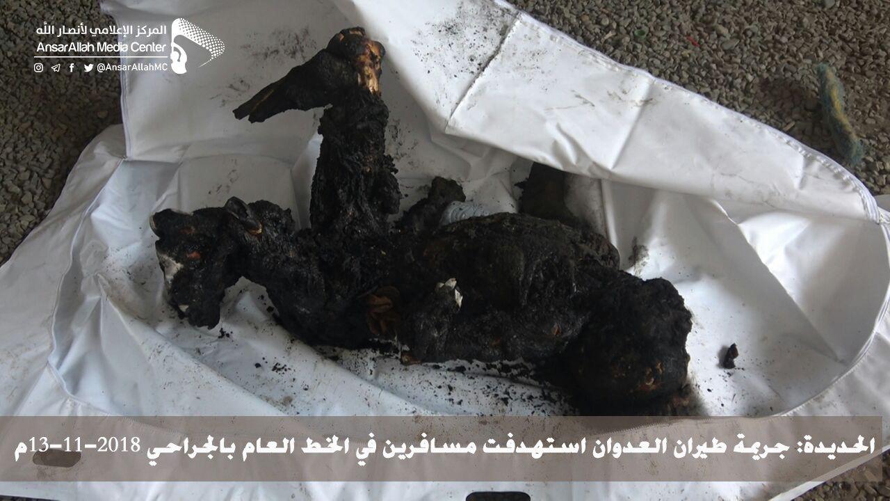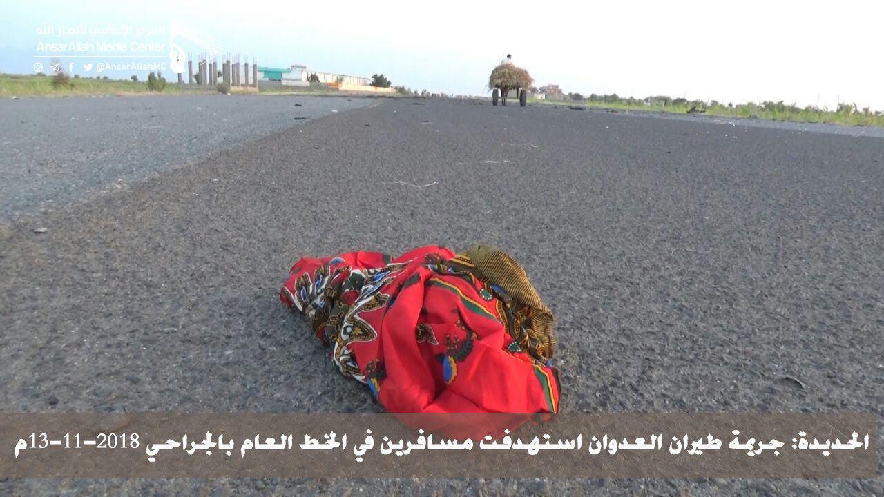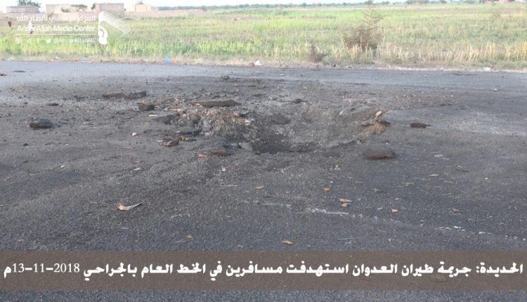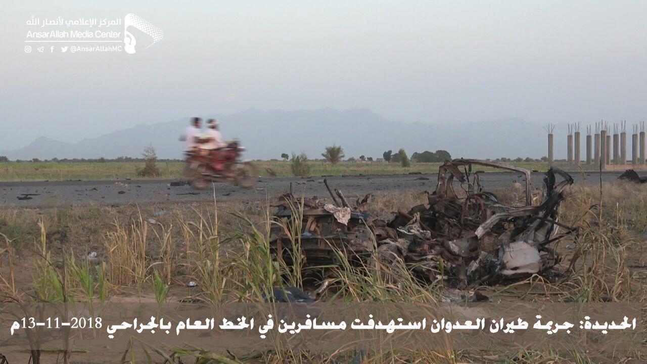وأكدت مصادر طبية في الحديدة، أن «طيران التحالف استهدف سيارة تقل مسافرين على الخط العام في مديرية الجراحي، ما أدى إلى مقتل 8 مدنيين، وإصابة آخرين في حصيلة أولية»، مشيرة إلى أن «القتلى المدنيين معظمهم نساء ورجال، كانوا في طريقهم إلى إحدى مديريات محافظة إب».