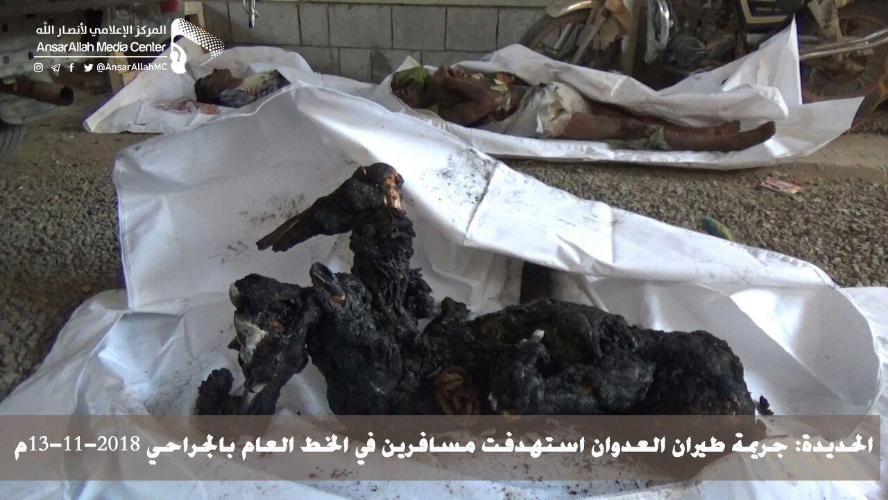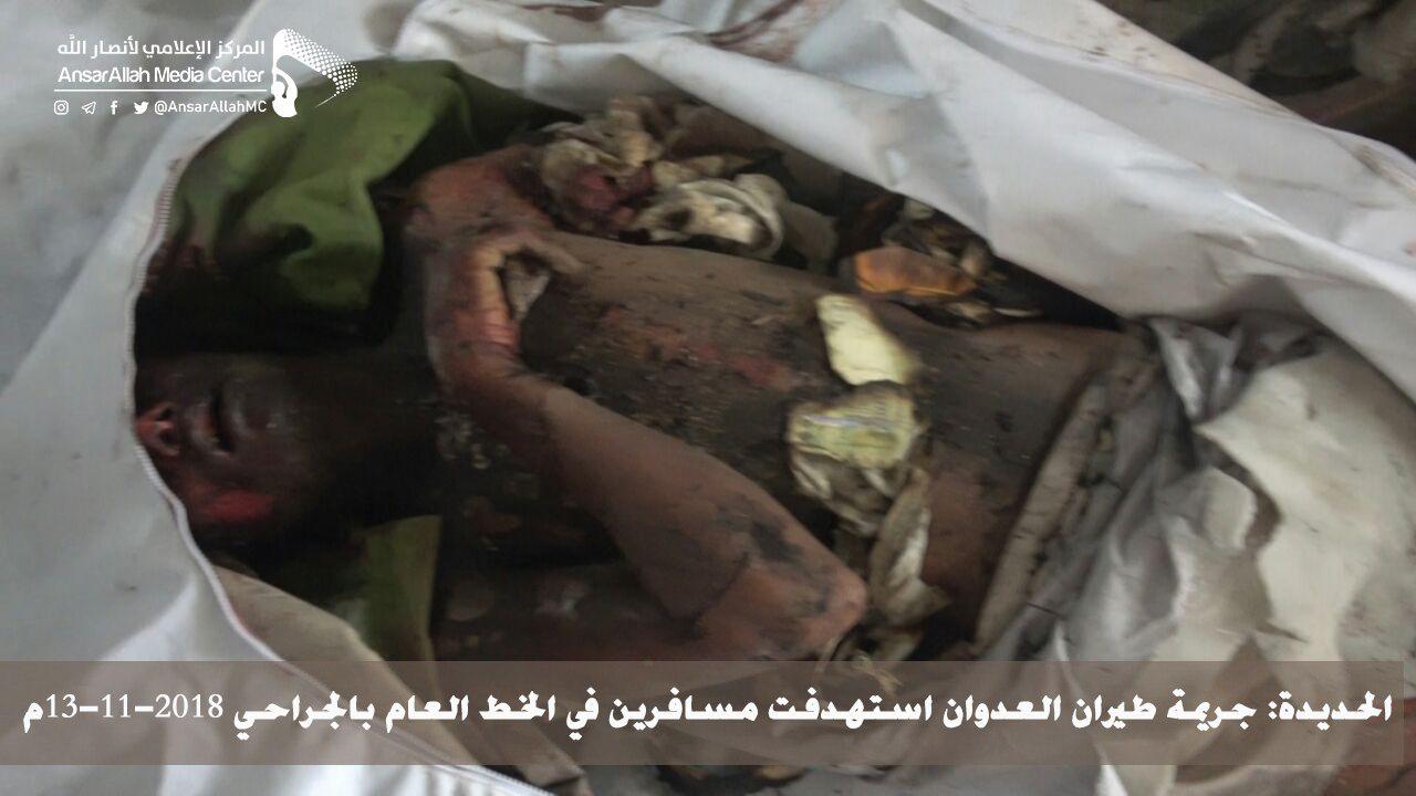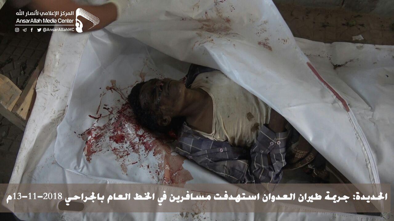 ارتفعت حصيلة جريمة طيران التحالف العربي بقيادة السعودية التي ارتكبها مساء امس بحق مسافرين في الخط العام بمديرية الجراحي بمحافظة الحديدة إلى 9قتلى وجريحين.