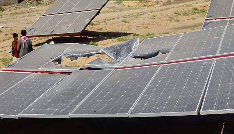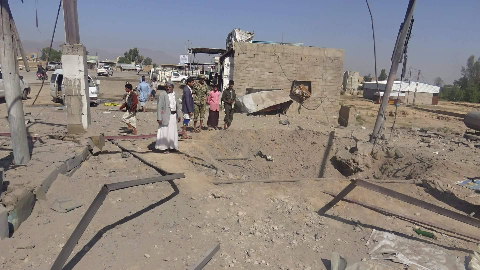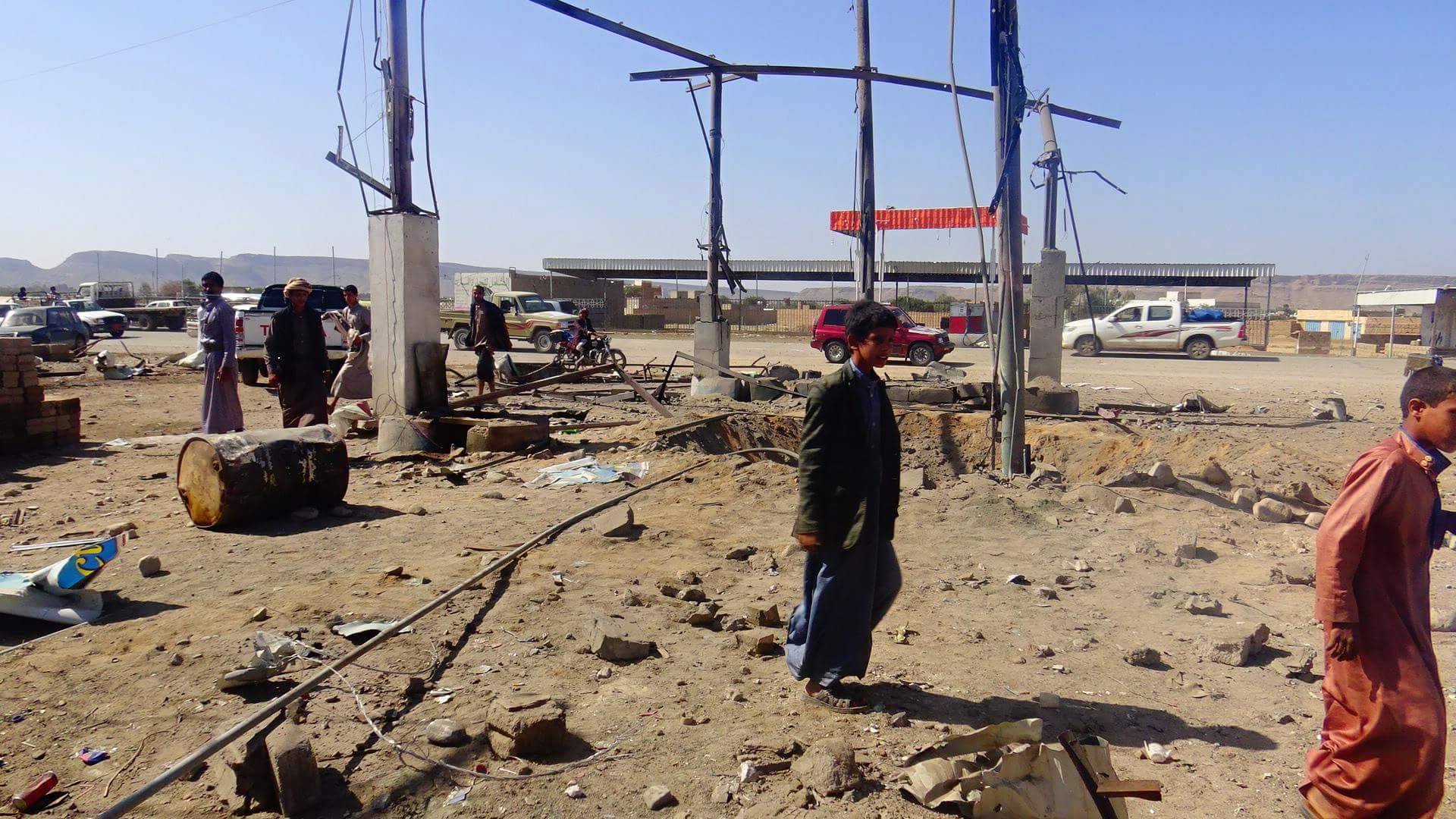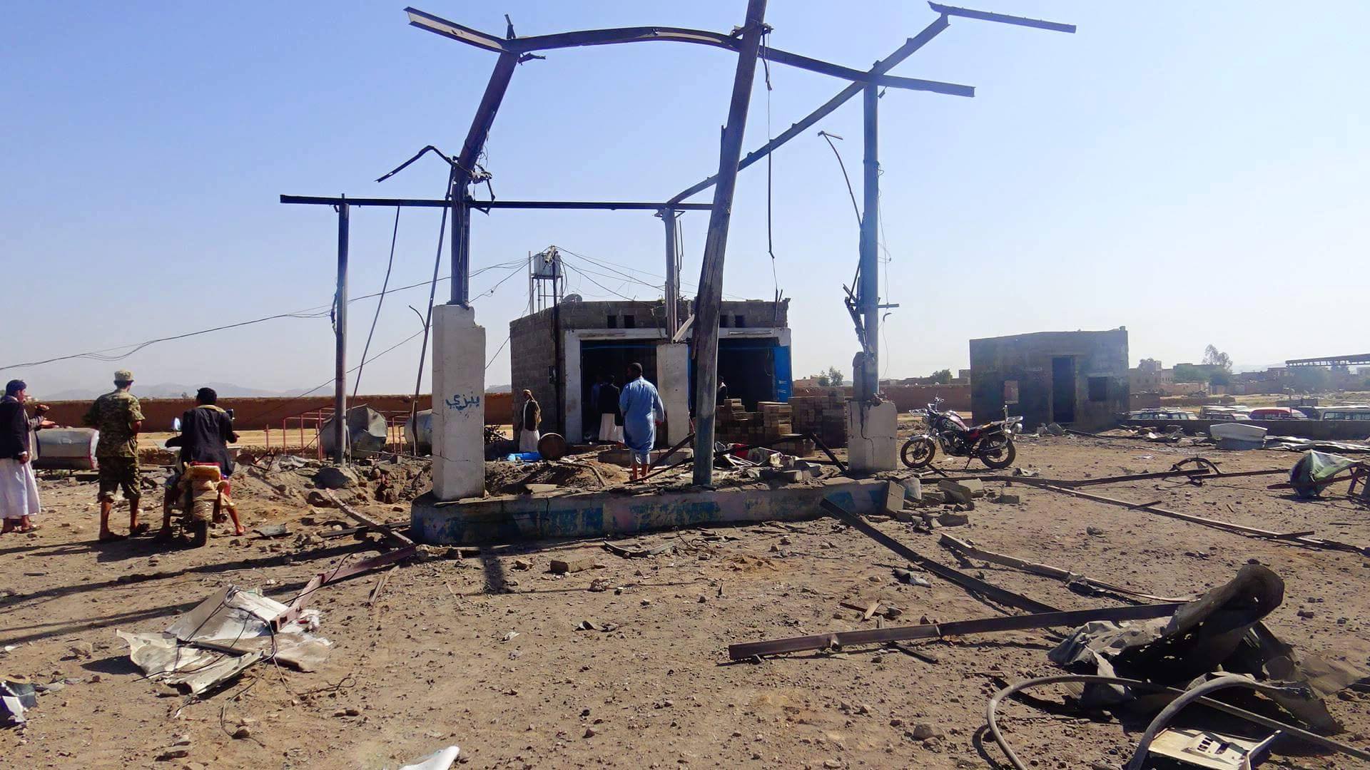صور محطة وقود في الشارع العام بمنطقة بني معاذ استهدفها طيران التحالف العربي بقيادة السعودية بغارة مما ادى الى تدميرها وتدمير منظومة طاقة شمسية لمزرعة احد المواطنين كانت مجاورة للمحطة وتضرر ممتلكات المواطنين المجاورة للمحطة