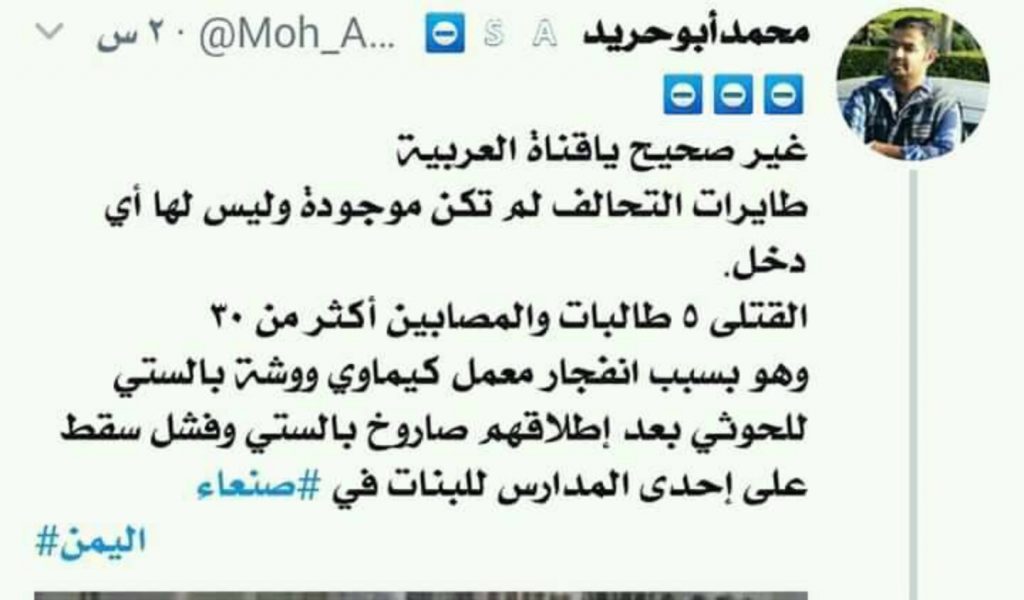 في المقابل، عمدت وسائل إعلام التحالف حال انتشار صور المجزرة التي اقترفتها الغارات، إلى حذف اخبارها عن “شن طيران التحالف غارات عدة استهدفت معسكرا تدريبيا للمليشيا الحوثي في ضاحية سعوان شرق العاصمة صنعاء ” كما زعمت ظهر الأحد.