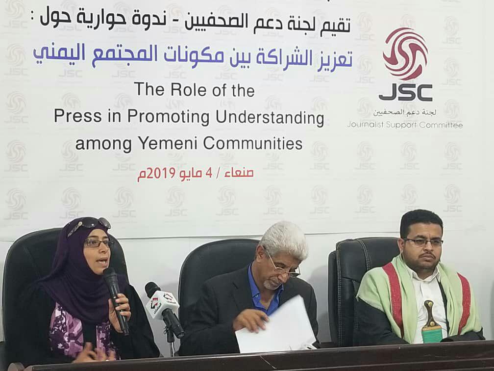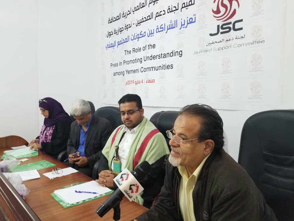 بحثت لجنة دعم الصحفيين مع جمع من الأكاديميين والسياسيين والإعلاميين والصحافيين في ندوة بالعاصمة صنعاء دور الصحافة في تعزيز الشراكة بين مكونات المجتمع اليمني، وجرائم التحالف بقيادة السعودية والإمارات بحق الإعلام المناهض له والإعلاميين في اليمن.