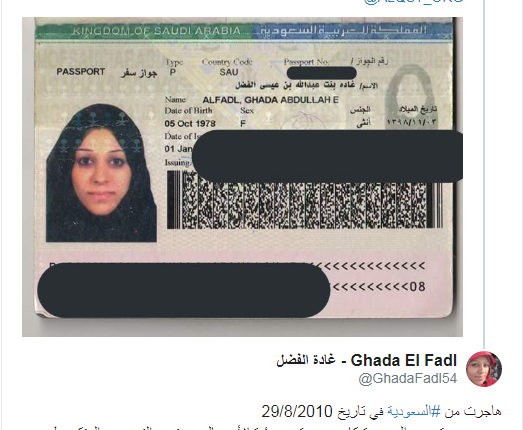 و روت قصتها بأنها “هاجرت من #السعودية في تاريخ 29/8/2010 وسبب هجرتي من السعودية كان بسبب تهجم هئية الأمر بالمعروف (الشرطة الدينية) على مصدر رزقي وهو محل نسائي خاص وقد تم توجيه الي تهمه الاحتفال بمولد النبي محمد (ص) و الاعتداء علي شخصياً و إغلاق محلي ومصدر رزقي”