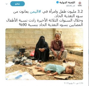 وقالت اللجنة في تغريدة على حسابها تويتر بالأمس : إن عدد الأطفال المصابين بسوء التغذية الحاد زاد خلال السنوات الثلاثة الأخيرة بنسبة 90% .