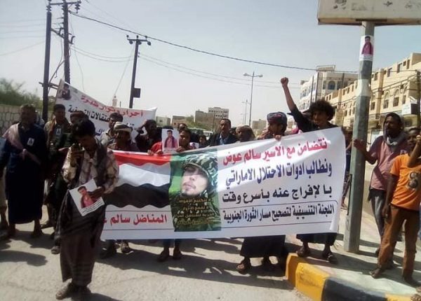 خرج العشرات من أبناء شبوة صباح السبت في وقفة احتجاجية تنديدا باعتقال القيادي في المجلس الثوري الجنوبي سالم عوض الذي اعتقلته مليشيا النخبة الشبوانية الممولة من قوات الإحتلال الإماراتي قبل أيام.