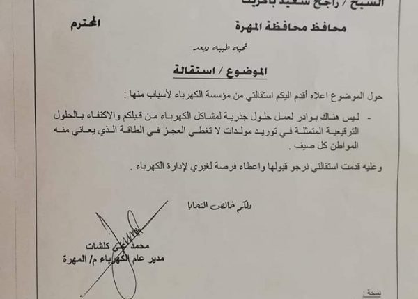 وحصل “وكالة الصحافة اليمنية ” على نسخة من استقالة كلشات، التي أشار فيها إلى أسباب استقالته، ومنها عدم معالجة المحافظ لمشاكل الكهرباء التي يعاني منها المواطن في محافظة المهرة كل صيف.