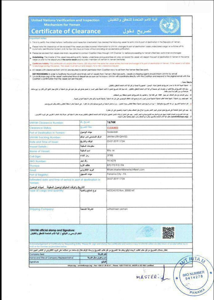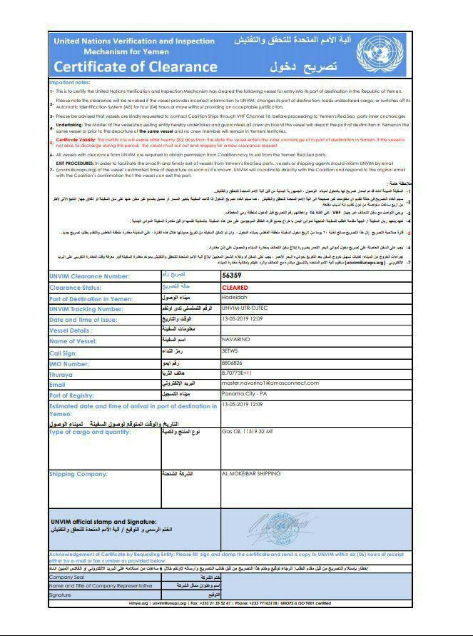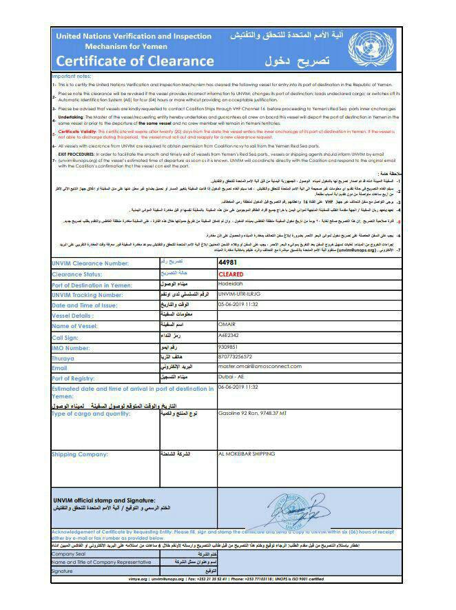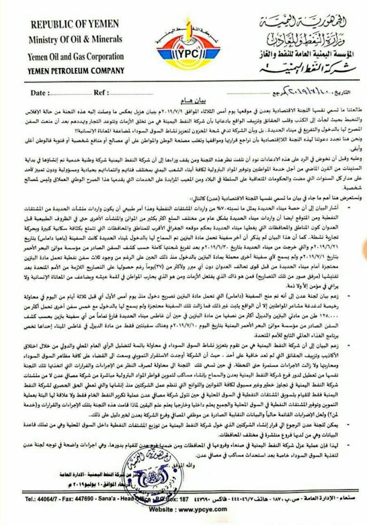 بيان شركة النفط، لفت إلى تجاهل لجنة عدن أن أخر سفينة تحمل مادة البنزين تم السماح لها بدخول ميناء الحديدة كانت السفينة باهيا داماس بتاريخ 21 يونيو وخرجت من الميناء بعد تفريغ شحنتها كاملة بتاريخ 30 يونيو حسب كشف السفن الصادر من مؤسسة موانئ البحر الأحمر بتاريخ 1 يوليو”.