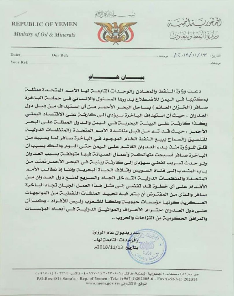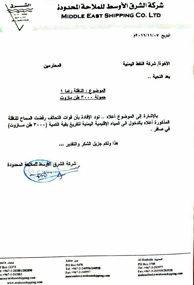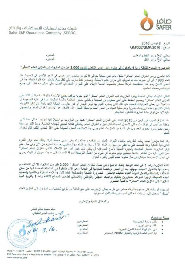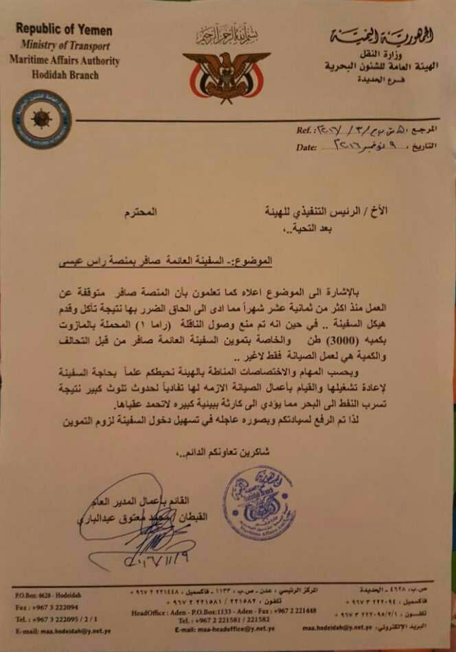 وحذرت الشركة من أنه في حال عدم توفير مادة المازوت فإن «الشركة تتوقع حصول حريق أو انفجار في الباخرة صافر سيؤدي الى تلوث بحري غير مسبوق في البحر الأحمر وسيشكل تحديا لليمن ودول المنطقة». وأكدت إخلاء مسؤوليتها وتحميلها التحالف «مسؤولية التداعيات”.