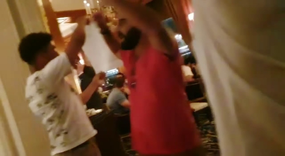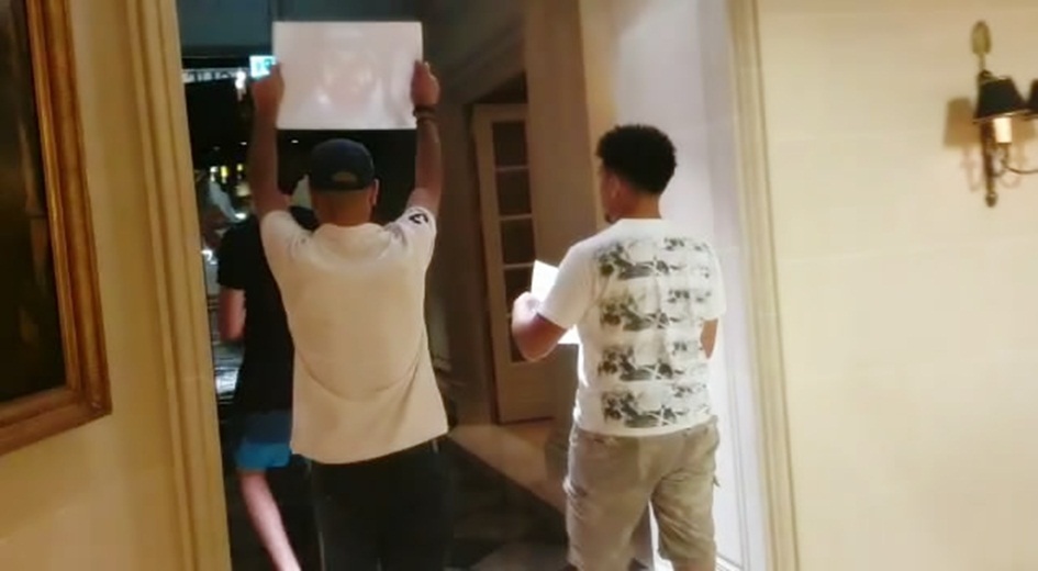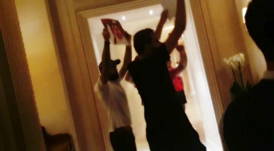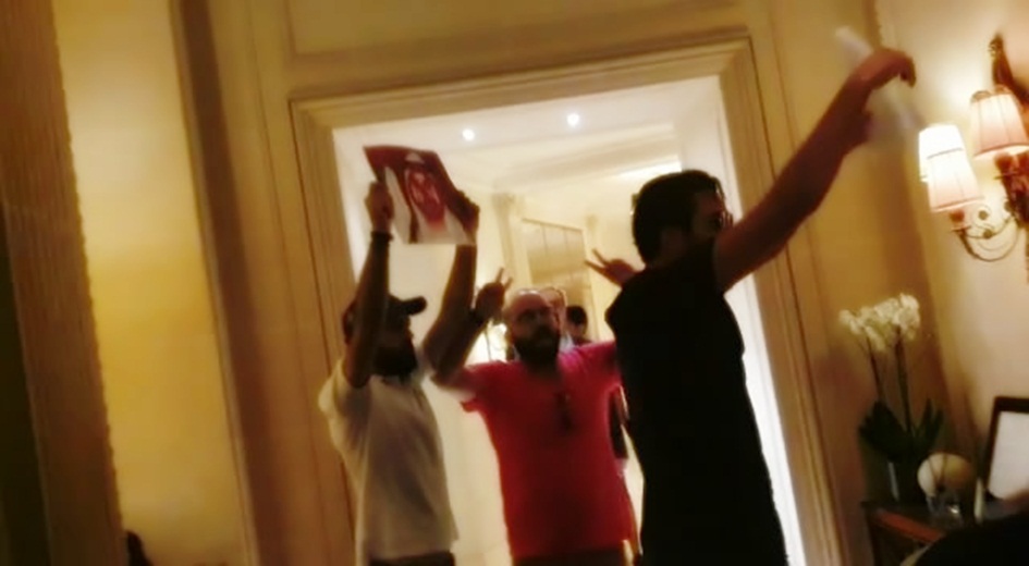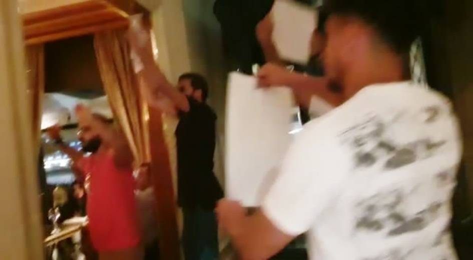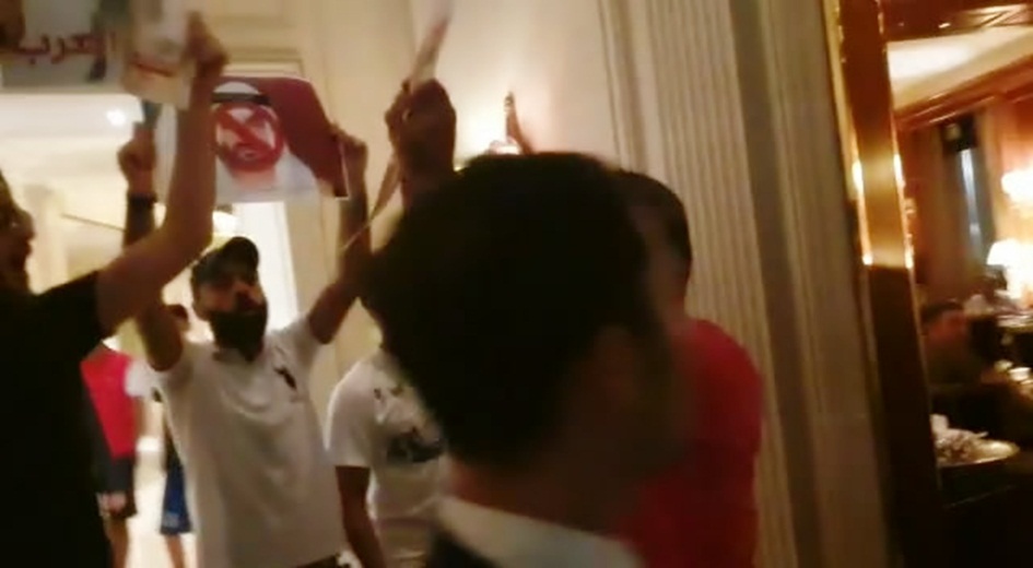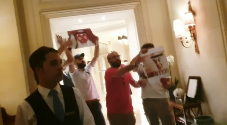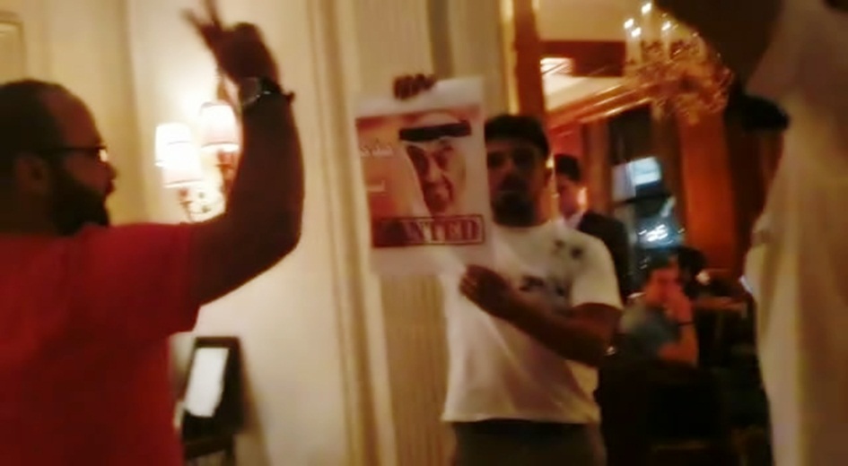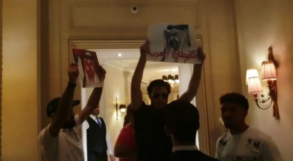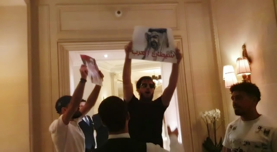 مقطع الفيديو أظهر نشطاء وهم يقتحمون مقر إقامة محمد بن زايد في فندق “فورسيزرن”، مرددين هتافات مناهضة لحربه والسعودية في اليمن وجرائمها، وتصفه بأنه “مجرم حرب”.