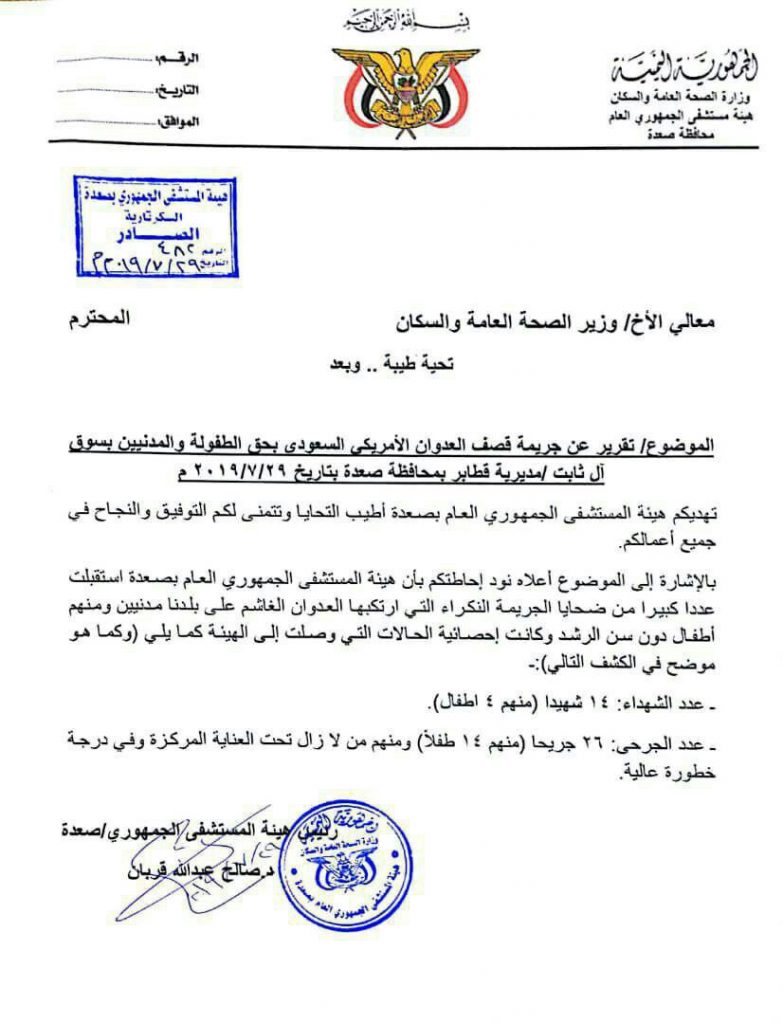 محصلة ضحايا جريمة قصف طيران التحالف “سوق آل ثابت” في مديرية قطابر بمحافظة صعدة، تخطت سقف الأربعين قتيلا وجريحا مدنيا نصفهم أطفال، وفق ما أعلنه، مساء الاثنين، مدير هيئة المستشفى الجمهوري في محافظة صعدة.