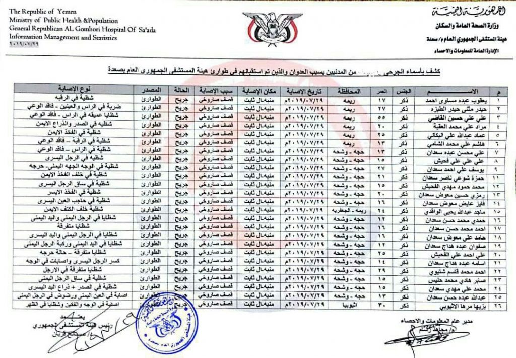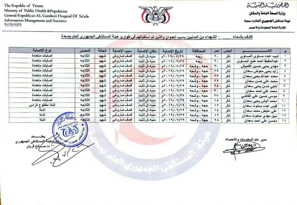 المتأمل لقوائم أسماء وأعمار الضحايا، القتلى والجرحى، يكاد يرى هول المصيبة التي خلفتها المجزرة الجريمة الجديدة للتحالف، ويسمع أصوات عويل الأمهات الثكالى والأطفال اليتامى والنساء الأرامل، فقد حصدت المجزرة، ذكور أسر بأكملها.