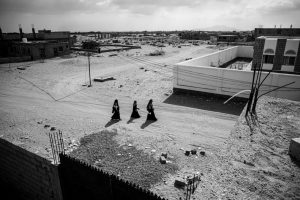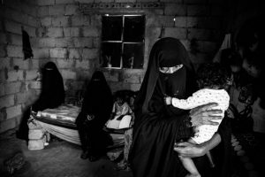 فلة مقبل محمد أحمد ، النازحة بسبب القتال في تعز  مع ابنتيها التوأم ، يسرا ويمنى ، خارج منزلهما المستأجر في مستوطنة للنازحين في ضواحي عدن. تقول فلة : ” نحن عائلتان نعيش في هاتين الغرفتين وبدون مطبخ”.. تعيش عائلات مثلها يومًا بعد يوم على المساعدات من المنظمات غير الحكومية .