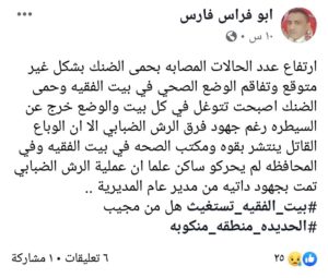 وكان وباء حمى الضنك والملاريا قد بدأ ينتشر بالمديرية منذ اسبوع وتم تسجيل إصابة العشرات وسط تحرك شعبي وحكومي للقضاء على هذا الوباء وذلك من خلال ردم المستنقعات المائية ورفع المخلفات والقمائم المتكدسة بالشوارع الرئيسية والفرعية والتي يعتقد أنها هي المكان المناسب لتكاثر البعوض المسبب الرئيسي للأمراض والأوبئة….