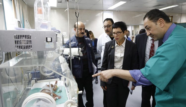 وفي غزة، زارت مستشفى رئيسيا، واطلعت على الآثار التي يخلفها الحصار من حيث الحرمان من الحياة وكذلك الأثر السلبي للانقسام السياسي الفلسطيني.