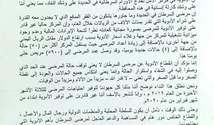 مشيرا إلى أن نفاذ الأدوية سيؤدي إلى توقف المركز عن تقديم خدماته وسوء الحالة الصحية للمرضى وتعرض حياة الكثيرين منهم للإنتكاسة والوفاة .
