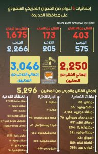 وأوضح التقرير الصادر عن المنظمة أن إجمالي القتلى المدنيين بالحديدة خلال الفترة 26 مارس 2015م حتى 26 مارس 2020م بلغ ألفين و252 قتيل منهم 174 امرأة و403 أطفال.