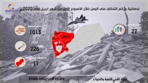 التوثيق المرئيمعرض الصور إحصائية جرائم التحالف على اليمن خلال الإسبوع الأول من شهر ابريل لعام2020 On أبريل 11, 2020 Share Share FacebookTwitterGoogle+WhatsAppPinterestالبريد الإلكترونيLinkedinTelegramPrint