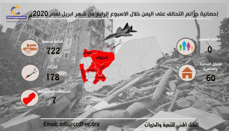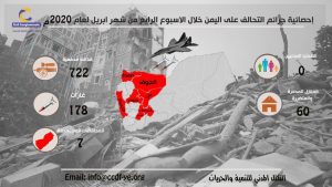 التوثيق المرئيمعرض الصور إحصائية جرائم التحالف على اليمن خلال الإسبوع الرابع من شهر ابريل لعام 2020 On أبريل 29, 2020 Share Share FacebookTwitterGoogle+WhatsAppPinterestالبريد الإلكترونيLinkedinTelegramPrint