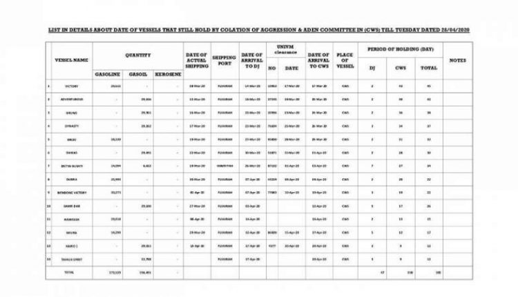 الصورة لكشف تفصيلي بالسفن النفطية المحتجزة والكميات على متنها حتى تاريخ 28 أبريل2020.