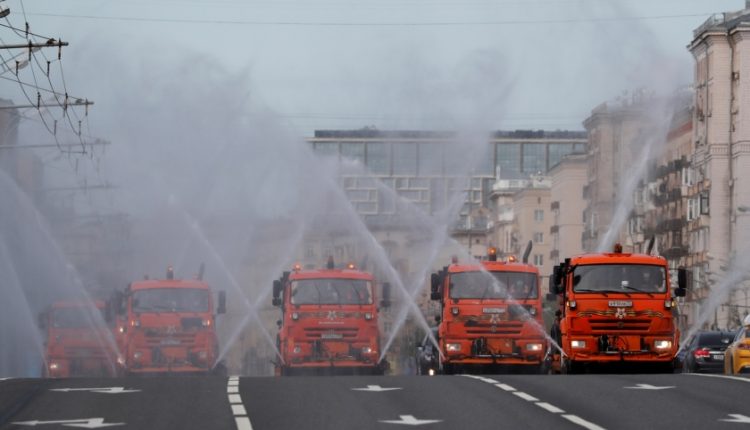 Vehicles spray disinfectant while sanitizing a road amid the outbreak of the coronavirus disease (COVID-19) in Moscow, Russia May 16, 2020. REUTERS/Shamil Zhumatov