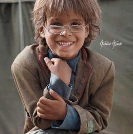 بجوار خيمته في مخيم “جو النسيم” شرق مدينة مأرب كان محمد يرتدي نظارته على مرور المصور عبدالله الجرادي الذي كان زار المخيم ، وكان في مهمة تصوير فلم اسناني، وقد التقط صورا تظهر الطفل محمد وهو مبتسما فرحا بنظارته.