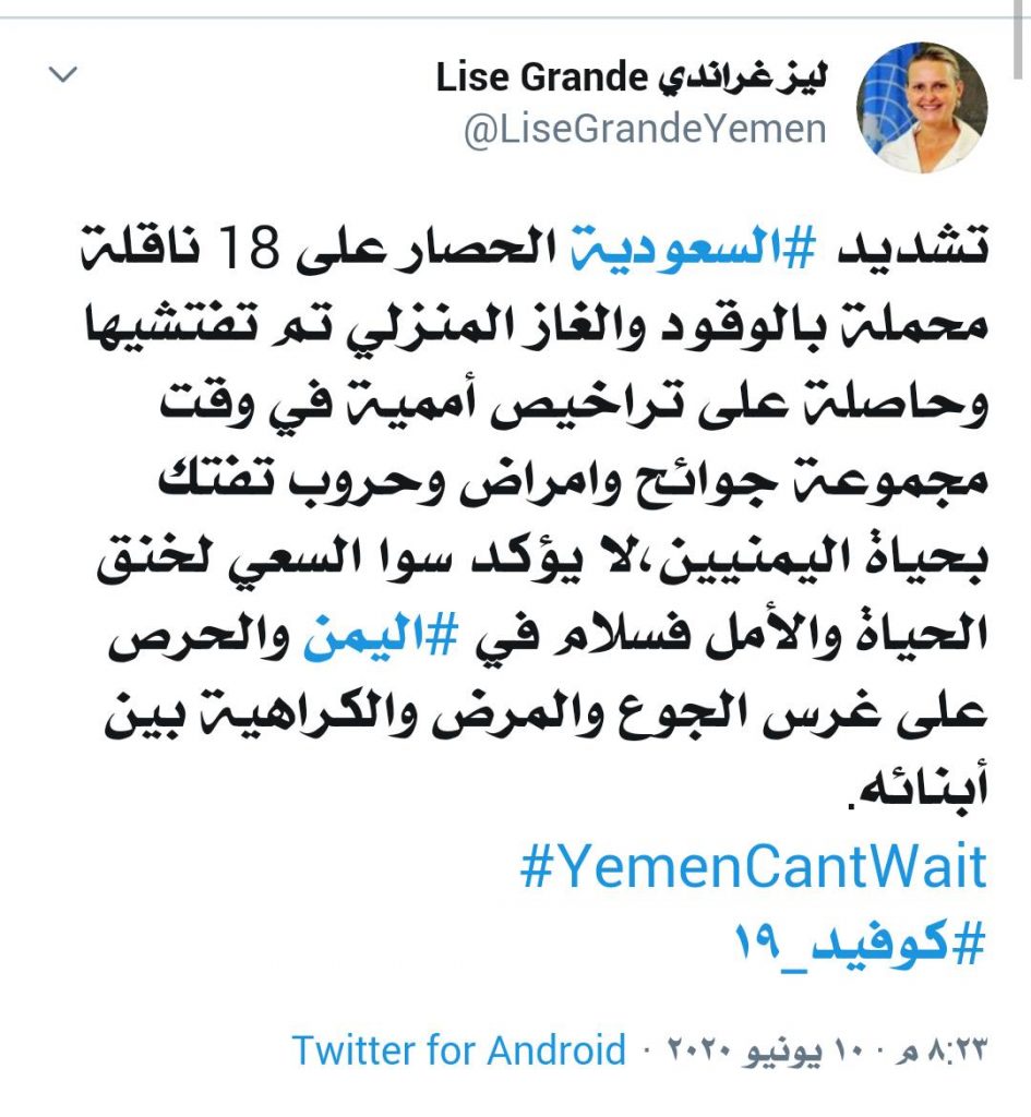غراندي استنكرت في تغريدتها منع التحالف السماح بدخول ميناء الحديدة سفن الوقود والغاز “تم تفتيشها وحاصلة على تراخيص أممية في وقت مجموعة جوائح وأوبئة وحروب تفتك بحياة اليمنيين” حسب تأكيدها.