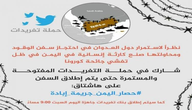 تنطلق الليلة في تمام الساعة التاسعة مساء يوم السبت على موقع التواصل الاجتماعي تويتر حملة تغريدات مفتوحة ومستمرة للمطالبة بإطلاق سفن المشتقات النفطية المحتجزة في عرض البحر من قبل دول التحالف تحت هاشتاغ #حصار_اليمن_جريمة_إبادة.
