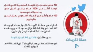 تنطلق الساعة التاسعة من مساء اليوم الأربعاء حملة تغريدات على موقع التواصل الاجتماعي “تويتر” بمناسبة مرور 100 عام على مجزرة تنومة المنسية التي قتل فيها أكثر من 3000 حاج يمني أعزل على يد عصابات الاجرام من آل سعود..”100 عام وأكثر من الإجرام السعودي بحق اليمن واليمنيين”.