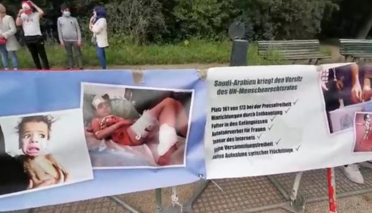 ورفع المشاركون في الوقفة الاحتجاجية أمام مبنى السفارة السعودية في برلين، صورا عدة لضحايا حرب وحصار التحالف على اليمن، وبخاصة الأطفال الذين سقطوا في اليمن نتيجة الغارات السعودية.