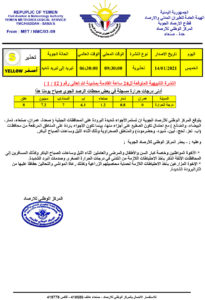 وبحسب نشرة الأحوال الجوية، للمركز الوطني للأرصاد الجوية اليمنية، ليوم الخميس 14 يناير 2021 والتي نشرها على صفحته بالفيس بوك ، فإن درجات الحرارة في صنعاء، بلغت العظمى 23 بينما الصغرى ،2 أما الحديدة فبلغت درجات الحرارة العظمى فيها 29 والصغرى 22 .