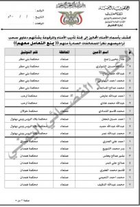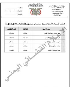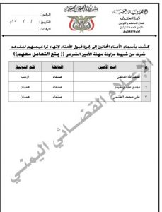 التقاريرتقارير محلية هام: تحذير من وزارة العدل للمواطنين في محافظة صنعاء On فبراير 15, 2021 Share كشفت وزارة العدل، عن أسماء الأمناء الشرعيين المسحوبة تراخيصهم والمحالين إلى لجنة تأديب الأمناء في محافظة صنعاء. أهابت وزارة العدل في بيان لها بالمواطنين عدم التعامل مع المنتحلين لصفة الأمين الشرعي ومن تم سحب تراخيصهم من الدفعة الأولى. وأوضحت أن أي محررات صادرة من الأمناء المنتحلين للصفة لن تقبل ولن يتم توثيقها وفقا للإجراءات القانونية. ودعت وزارة العدل جميع المواطنين إبلاغ الجهات الأمنية عن إي شخص ينتحل صفة الأمين للمصلحة العامة. هذا وضم البيان قوائم بأسماء الإمناء المسحوبة تراخيصهم و المحالين للتأديب بمحافظة صنعاء وعددهم 44 شخصا . Share FacebookTwitterGoogle+WhatsAppPinterestالبريد الإلكترونيLinkedinTelegramPrint