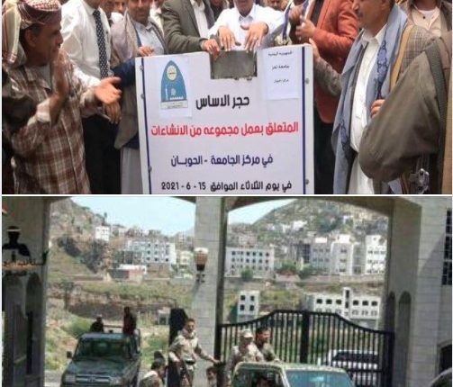 في المقابل وفي منطقة “الحوبان” التابعة لحكومة صنعاء قام عضو المجلس السياسي الاعلى “سلطان السامعي” ومعه وكيل أول محافظة تعز “صلاح بجاش” بوضع حجر الأساس لإنشاء معملي التعليم المستمر ومركز الحاسوب وإنشاء قاعات دراسية إضافية بفرع جامعة تعز في الحوبان”.