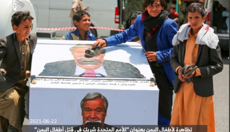 وتحت عنوان ” الأمم المتحدة شريك في قتل أطفال اليمن” هتف الآلاف من الأطفال اليمنيين منددين بالموقف المخجل للأمم المتحدة بحق طفولتهم المطحونة وحق أجساد أخوانهم واصدقائهم المتفحمة والمقطعة تحت ركام القصف والدمار.