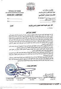 وأشار في مذكرة رفعها إلى هيئة الطيران بـ”حكومة هادي”، إلى عدم التزام كتيبة “الانتقالي” بالنظم والقوانين، سيؤدي إلى كارثة تهدد بسحب تراخيص استقبال الرحلات الدولية من قبل الإيكاو للطيران.
