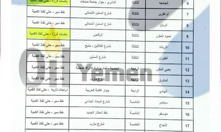 وفيما يلي كشف بأسماء المحطات التجارية العاملة في أمانة العاصمة صنعاء: