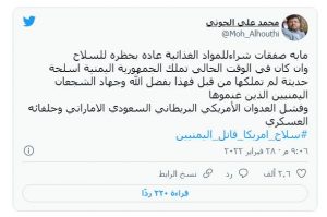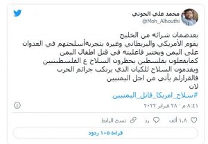 وقال عضو المجلس السياسي الأعلى في اليمن محمد علي الحوثي، أمس الإثنين، في سلسلة تغريدات على موقع “تويتر” إن “الاستهداف المتعمد لليمن من دول العدوان الأميركي البريطاني السعودي الإماراتي وارتكابها لجرائم الحرب معيار يدفع لحظر أسلحتها لو كانت العدالة هي المنشودة لا المال”.
