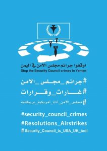 واطلقت اللجنة الوطنية للمطالبة بإيقاف جرائم مجلس الامن في اليمن، مساء الخميس الماضي، حملة تغريدات على وسائل التواصل الاجتماعي، حملت عنوان “أوقفوا جرائم مجلس الامن في اليمن” وهشتاق أخر باسم “مجلس الأمن أداة بيد أمريكا وبريطانيا”.