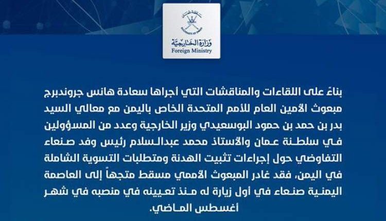 وقالت الخارجية العمانية عبر صفحتها على “تويتر”: بناءً على اللقاءات والمناقشات التي أجراها سعادة هانس غروندبرغ مبعوث الأمين العام للأمم المتحدة الخاص باليمن مع معالي السيد بدر بن حمد بن حمود البوسعيدي وزير الخارجية وعدد من المسؤولين في سلطنة عمان والأستاذ محمد عبدالسلام رئيس وفد صنعاء التفاوضي حول إجراءات تثبيت الهدنة ومتطلبات التسوية الشاملة في اليمن، فقد غادر المبعوث الأممي مسقط متجهاً إلى العاصمة اليمنية صنعاء في أول زيارة له منذ تعيينه في منصبه في شهر أغسطس الماضي.
