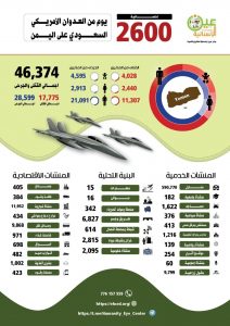 وفيما يخص البنية التحتية ذكرت الاحصائية أن طيران التحالف  دمر 15 مطارا و16 ميناء 342 محطة ومولد كهرباء و6827 طريقا وجسرا و 614 محطة اتصال، بالإضافة لتدمير 2815 خزان وشبكة مياه و2095 منشأة حكومية .