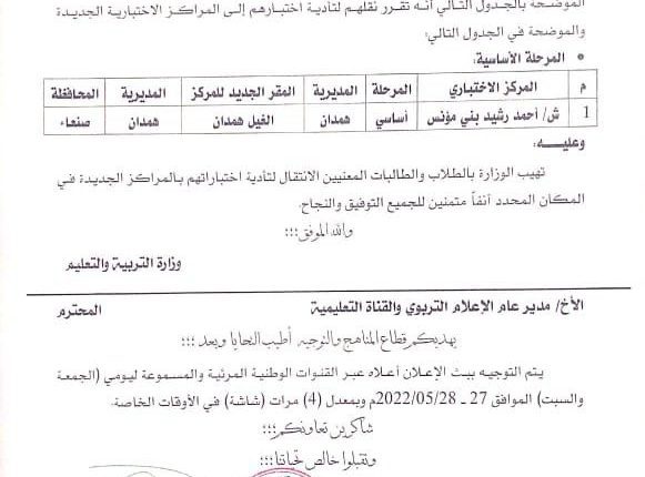 التقاريرتقارير محلية صنعاء ..نقل مركز اختباري للشهادة الأساسية في مديرية همدان On مايو 28, 2022 Share أعلنت وزارة التربية والتعليم عن نقل المركز الاختباري “الشهيد أحمد رشيد بني مؤنس في مديرية همدان الى المركز الجديد ” الغيل همدان ” . وأهابت الوزارة للطلاب والطالبات المتقدمين لأداء الاختبارات الاساسية العامة في المركز الانتقال لتأدية اختبارهم في المركز الجديد . Share FacebookTwitterGoogle+WhatsAppPinterestالبريد الإلكترونيLinkedinTelegramPrint
